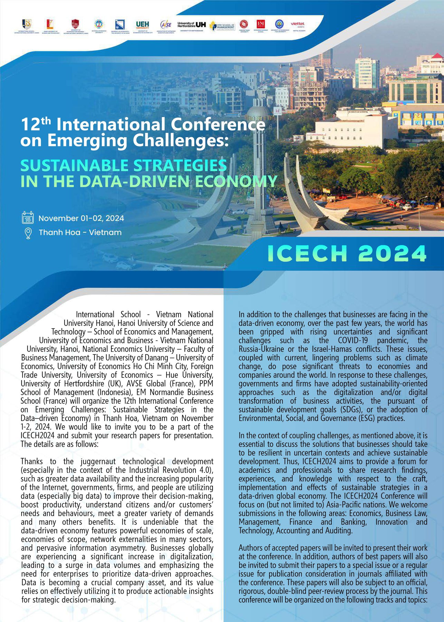 Kính mời các nhà khoa học, chuyên gia, nghiên cứu sinh của Quý đơn vị trong lĩnh vực Kinh tế, Luật kinh doanh, Kinh doanh, Quản lý, Tài chính ngân hàng,… viết bài tham dự Hội thảo quốc tế lần thứ 12 về các thách thức mới nổi: Chiến lược bền vững trong nền kinh tế định hướng dữ liệu, Việt Nam (ICECH 2024) – The 12th International Conference on Emerging challenges: Sustainable Strategies in the Data – Driven Economy được tổ chức vào ngày 1-2/11/2024 tại Thanh Hóa, Việt Nam.