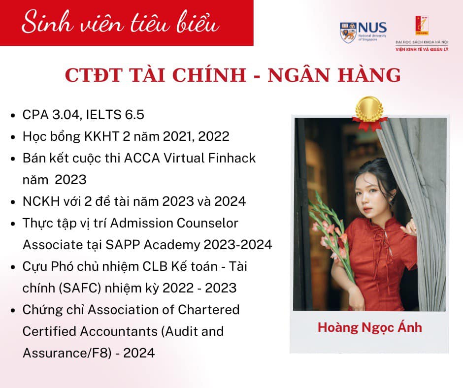 – Viện Kinh tế và Quản lý (SEM), Đại học Bách Khoa Hà Nội (HUST) tự hào thông báo về kết quả tuyển chọn 3 sinh viên xuất sắc tham gia chương trình thực tập liên kết với NUS Enterprise Academy, Đại học Quốc gia Singapore (NUS). Đây là chương trình trao đổi uy tín, mang đến cơ hội quý giá cho sinh viên trải nghiệm môi trường học tập và nghiên cứu quốc tế, nâng cao kiến thức, kỹ năng và tầm nhìn quốc tế, đồng thời mở rộng cơ hội nghề nghiệp trong tương lai