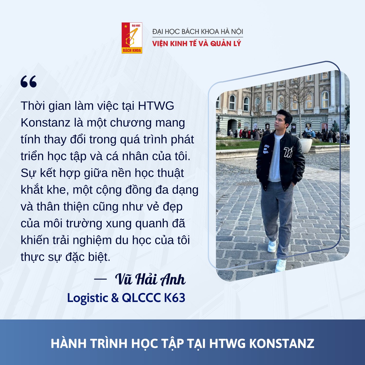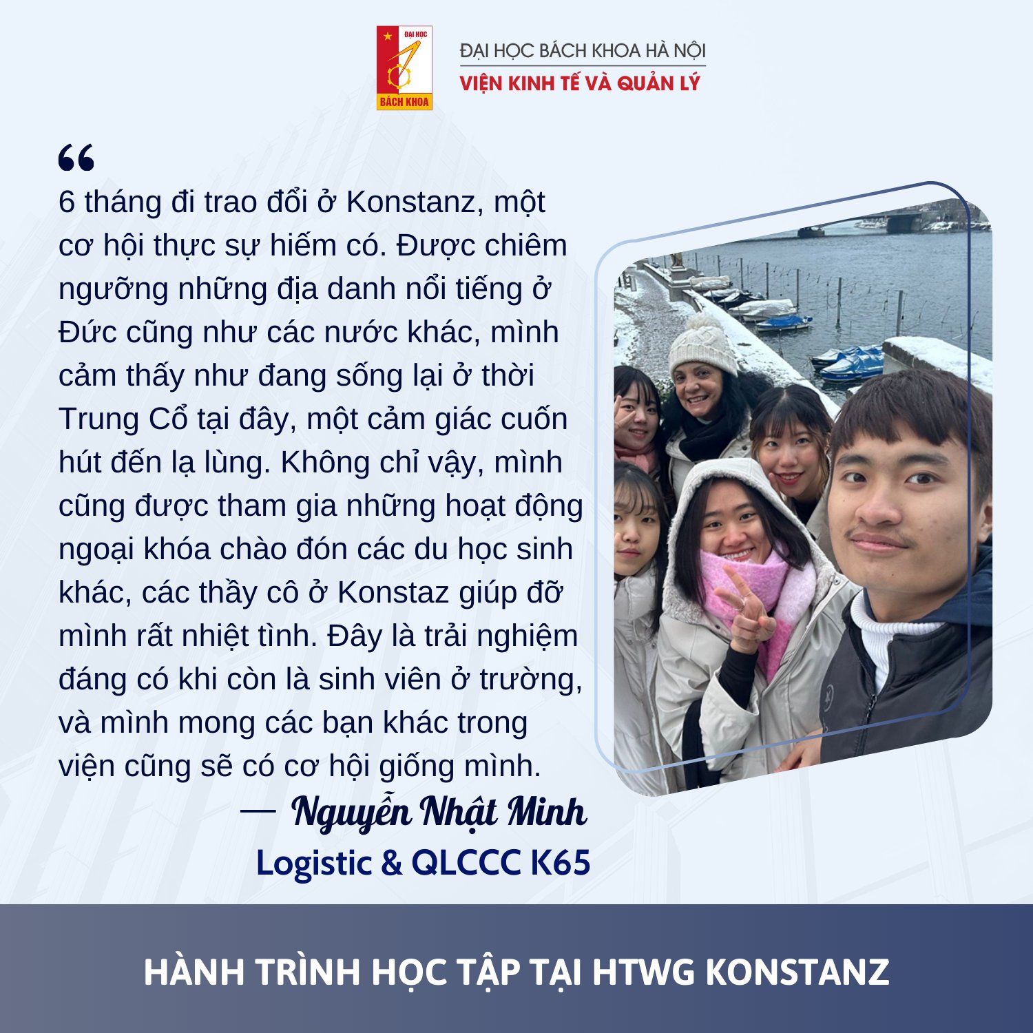 – Chuyến đi trao đổi học thuật tới Đại học Konstanz (Đức) của 2 bạn sinh viên Vũ Hải Anh – EM-NU17 K63 và Nguyễn Nhật Minh – Logistics và QLCCU K65 năm ngoái là một trải nghiệm đáng nhớ, mang đến cho cả hai nhiều kỷ niệm và bài học quý báu.