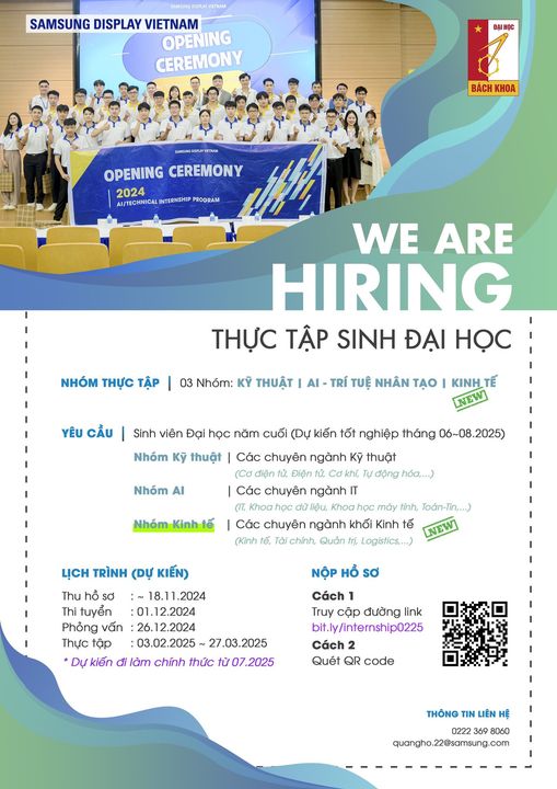 Thông báo Chương trình Thực tập sinh tại Công ty Samsung Display Việt Nam